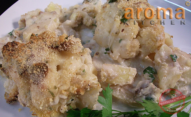 Boil the cauliflower in salted water until nearly done. Drain and cut into florets. Cut the potatoes into medium-sized slices and boil in salted water until nearly done. Drain. Meanwhile make the sauce. Melt the butter and add the flour and nutmeg. Cook over a medium heat for 1 minute while stirring. Gradually mix in the milk while stirring continuously with a whisk. Season with salt and pepper and gradually bring the sauce to the boil while whisking. Remove from heat. Grease an ovenproof dish with butter. Arrange the potatoes sprinkle over some grated Parmesan, half the walnuts and pour over half the sauce. Place the cauliflower florets, sprinkle over some Parmesan and the remaining walnuts. Pour over the remaining sauce and sprinkle over the breadcrumbs. Bake in a moderate to slightly hot oven for 45 minutes or until the top is nicely browned. Suggested accompanying wine: DELICATA Victoria Heights Chardonnay D.O.K. Superior Gozo