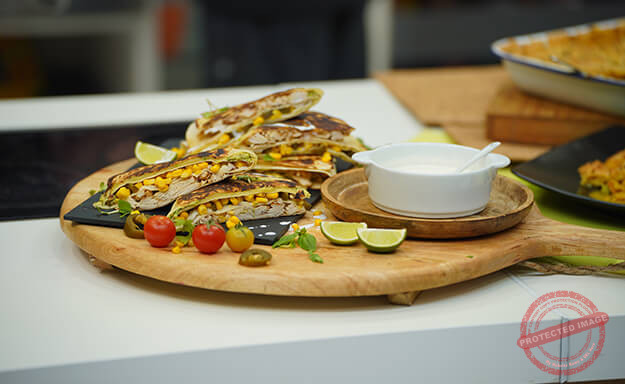 This is an easy snack to prepare. Start by mixing together the fresh cream and the juice of 1 lime to make sour cream. Mix in some chopped fresh coriander and place into the fridge. Next, lay out your large wraps and make a slit in both from the center down. Cover ¼ of each with pulled chicken and top with cheese slices, another ¼ with diced tomatoes, onions, sweet corn and more cheese slices, another ¼ with avocado slices and fresh coriander leaves. Next, fold the remaining ¼ with nothing on top of the avocado. Fold this again over the tomato section, finally fold this over the pulled chicken ¼. Drizzle with a little olive oil and heat through in the oven for a few minutes to melt the cheese. Serve immediately with salad leaves on the side and the prepared sour cream.