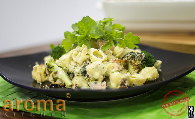 Cheesy salmon and broccoli pasta bake with hazelnut and Parmesan crust