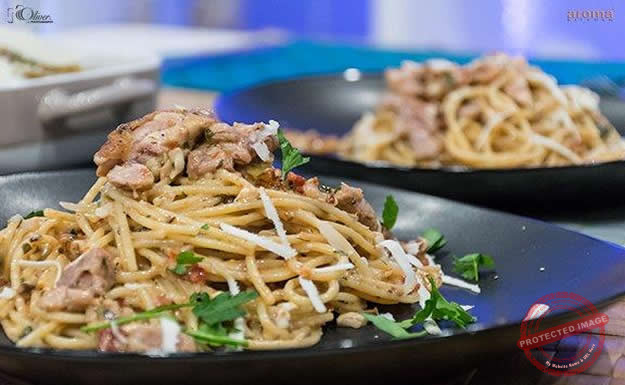 Preheat well a sauté pan and seal the chicken fat side first, place chicken on an oven tray and finish in the oven. On very low heat add the chopped garlic, butter, chopped sun dried tomatoes, chopped olives, leeks and also chopper sage to the pan, keep infusing the flavors on very low heat. Once chicken is cooked trough, slice on a chopping board and toss in the pan with all its juices, pour in the cream goat cheese and reduce. Boil the gluten free pasta leaving it al dente and than toss it in the sauce for a few minutes together with the nuts and serve.