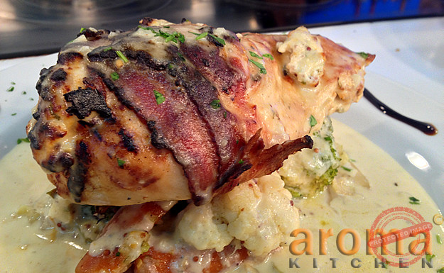 Chicken breast wrapped in bacon, stuffed with cheese and pears