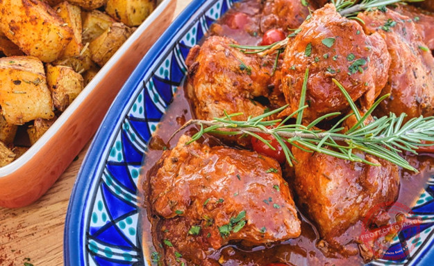Chicken cacciatore with rosemary and paprika baked potatoes
