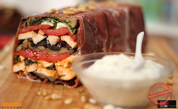 Start this recipe by lining a long loaf tin with cling film, allowing excess to hang out over the edge. Next, line the tin with the Parma ham slices, overlapping and again allowing the excess to overhang. Next, fill up the tin with layers of all the ingredients, layer after layer until you have filled up the tin completely, grinding in some salt and pepper in between layers. Press down firmly and fold over the excess Parma ham into the middle sealing the top. Place into the fridge to set for 3 hours or overnight. Meanwhile, make the dip by mixing all of the ingredients together and season with a little salt and pepper. When ready to serve, tip out onto a serving board and remove the cling film. Decorate the top with extra toasted pine nuts and basil leaves and serve with the yogurt dip on the side.