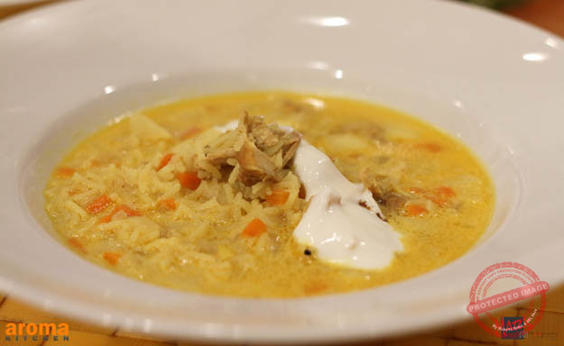 Sautee the vegetables and bay leaf in hot melted butter and olive oil for a couple of minutes. Add in the chicken meat and mix to coat with the curry mixture. Cover with the chicken stock and simmer for 20 minutes. Take the chicken out, add in the rice and apples and simmer till rice is cooked. Meanwhile flake the chicken meat, stir back in the soup and serve piping hot garnished with yogurt