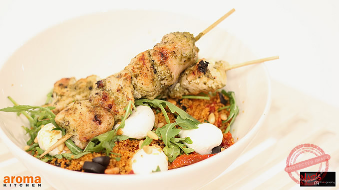 Skewers tat-tiġieġ bil-pesto ma’ insalata tal-kuskus stil Taljan