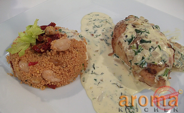 Start this recipe by sealing the chicken on side both sides till light brown. Remove the chicken from the pan and add 100g of the chopped onion and the spinach and cooked for a few minutes. Add 100g of gorgonzola and the peanuts to the pan and continue to cook for 3-4 minutes more before removing off the heat. In a sauce pan, sauté the remaining onions with the butter for a few minutes then add the remaining gorgonzola to the pan, along with the cream and parsley. Cut a small pocket into each piece of chicken and continue to cook in the oven for 10 minutes at 200`C. When ready, removed from the oven and fill with the spinach mixture. Serve whilst still hot with the sauce drizzled over the top.