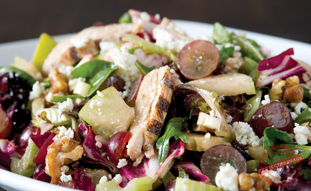 To prepare the salad, place the prepared apples, celery, walnuts, grapes and spring onions into a medium sized bowl. Stir in the lemon juice to stop the apples from turning brown. In a small bowl, mix together the mayonnaise, Greek yogurt, mustard, garlic and parsley. Season well with salt and pepper and mix into the salad, coating all the ingredients well. Place in the fridge while you cook the chicken. Heat the oil in a small griddle pan and season the chicken pieces with salt and pepper. Place the chicken in the hot pan with the rosemary sprig and garlic and fry on both sides for about 4-5 minutes. When ready, remove off the heat, allow to sit for 2 minutes, then cut into slices. To serve, spoon the crunchy Waldorf salad onto 2 large plates and arrange the chicken slices on top. Finish of with a few salad leaves as a garnish.