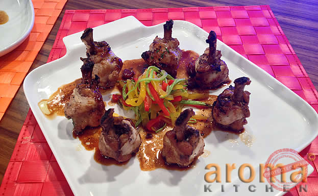 Pre-heat a pan and seal the chicken wings from both sides. Allow to rest for few minutes, then continue to cook in oven for 2 minutes at 180`c. Brush the wings with honey and cook for 2 minutes with the chicken stock and ham.