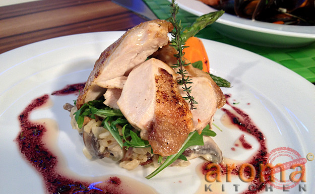 Chicken with pancetta and mushroom risotto and Marsala sauce