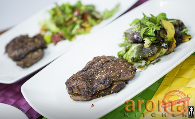 Cut the beef fillet in 4 steaks and flat them out to a minute steak, chop the chilies and toss the beef in the rest of the ingredients. Allow to rest and grill on high heat on the bbq. Next, prepare the salad. Chop the spring onions, Dill, walnuts, slice the celery, cucumber and quarter the cherry tomatoes. In a bowl with the salad leaves grate half the orange and squeeze all the orange than toss in all the other ingredients and serve on the side.