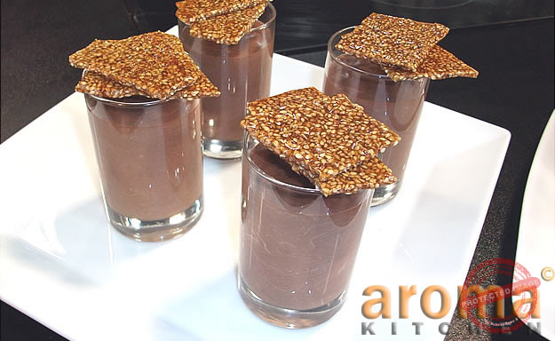 Start this recipe by making the chocolate brandy mousse. Melt the chocolate and the butter together in a pan over boiling water, and remove from heat. In a bowl, whip the double cream to soft peaks and put to one side. In a second bowl, whisk the eggs with the honey together until light and fluffy. Fold in the orange zest and brandy, followed by the melted chocolate mixture and then the whipped cream. You should have a rich, glossy chocolate brandy mousse. Pour the mousse into 4 tall glasses and refrigerate for at least 1 hour. Meanwhile, make the sesame caramel by putting the water and caster sugar together in a saucepan. Turn on the heat, and leave to bubble for about 5 minutes, till you have lightly golden caramel. Add in the sesame seeds, mix well and continue to cook till the caramel until it has turned a darker shade of golden brown. When ready, immediately pour the sesame caramel onto an oiled piece of greaseproof paper and flatten with a palette knife. (Do not touch the hot caramel with your fingers as it will burn). Once the sesame caramel is evenly flattened out, leave it to cool and harden for 20 minutes. When you are ready to serve, remove the chilled chocolate brandy cups from the fridge. Break up the hardened sesame caramel and place 2 pieces on the top of each glass.