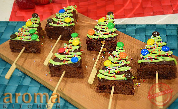 Preheat the oven to 170`c. Line a 30cm x 20cm cake tin with lightly buttered greaseproof paper. Put the dark chocolate and butter in a large bowl, place over a pan of simmering water and allow to melt. Sieve the flour and baking powder into a bowl and set aside. Remove the melted chocolate from the heat and stir in the sugar. Add the eggs and vanilla essence. Fold in the flour and pistachios. Pour the mixture into the prepared cake tin. Place in the oven and bake for 40-45 minutes. The top should be firm but the inside should feel soft when cooked. Allow to cool in the tin. Remove the brownies from the tin and cut into triangles. Using green icing, pipe a zigzag from the top to the bottom of the brownie triangles and sprinkle over coloured balls to decorate. Stick in a straw at the bottom of each brownie and serve.