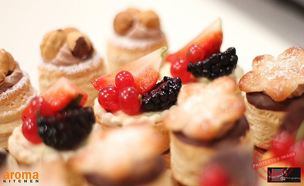 Start this recipe by lightly heating together in a pan the double cream and chopped dark chocolate until thick and glossy. Pour into a bowl and allow to cool. Use this mixture to fill the cooked vol au vent cases and allow to set. This can be day the day before or in the morning for the evening. Next, decorate the filled vol au vents using the chocolate pieces, berries and fresh mint leaves. Dust with icing sugar and serve.