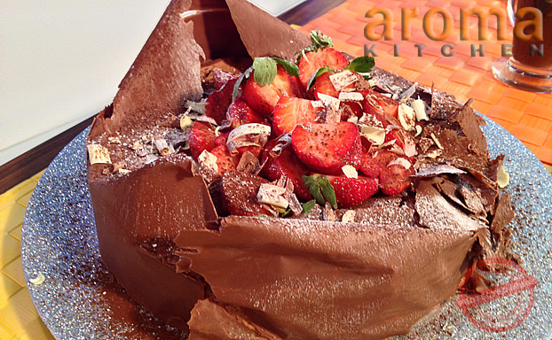 Start by making the sponge. Grease a 20cm cake tin with butter and lightly dust with flour. Whisk together the eggs and castor sugar until stiff and pale in colour. Combine together the flour and cocoa powder. Gently fold flour mixture into the egg mixture. Taking care not to over handle the sponge mixture, pour into the prepared cake tin and bake at 175°c for approximately 20 minutes. The sponge cake should be springy when touched by your finger tips and shrinks from the sides. Meanwhile, make the syrup. Bring the water and sugar to the boil in a saucepan. Remove from heat and allow to cool completely before pouring in the alcohol. Next, make the chocolate mousse by melting the chocolate in with half of the cream in a saucepan. Mix the sugar with a spoon of water and cook until it reaches a temp of 121°c. Whisk the yolks until thick and stiff. Carefully pour in the hot syrup, whisking constantly. Continue whisking until the mixture cools down. Pour in the ganache. Whip the remaining cream into soft peaks. Fold the cream into the chocolate mixture. To put the cake together, slice the sponge cake with a sharp serrated knife into 3 slices. Put the first slice of sponge on a cake board, in a 22 cm cake ring. Soak the sponge with the syrup and cover with a thick layer of chocolate mousse. Repeat this process with the remaining sponge and mousse. Put the cake in a refrigerator and allow chilling for a couple of hours before removing from the ring. Decorate cake with chocolate shavings and strawberries.