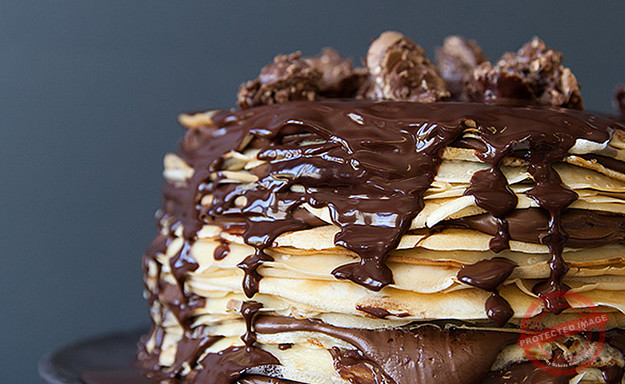 Start by making the chocolate ganache. Melt together the chopped chocolate and double cream in a saucepan then put aside to cool and set. To make the pancakes, place the flour and salt in a bowl and make a well in the middle. Break in the egg and gradually whisk in the milk to produce a smooth pancake batter. Before frying the pancakes, whisk in the melted butter. To cook the pancakes, heat up a large, non-stick pan and add in a little oil or butter. Pour a ladle of the pancake mixture into the pan and swirl around to coat the base of the pan. Cook the pancake for a minute or so, and then turn around onto the opposite side and continue to cook for a minute. Turn the pancake out onto a plate and repeat the same process with the remaining batter. To put the stack together, place a pancake on a cake stand and spread over a little of the ganache. Place over another pancake and repeat the process with all the remaining pancakes and ganache to form a stack. Finish off with a layer of ganache on the top, finished with the toasted hazelnuts and a dusting of icing sugar. Allow to set in the fridge for 1 hour before serving.