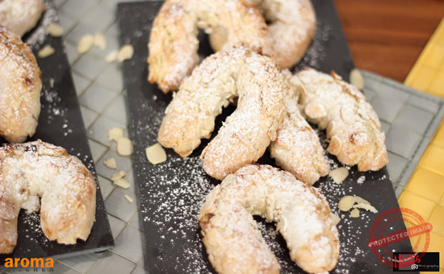 Start this recipe by placing the almonds, icing sugar, lemon zest and vanilla into a processor and blend together for 10 seconds. Add in 1 egg white and process till you achieve a firm dough. Continue to add in a little more egg white if necessary. Remove the almond dough from the processor and cut up into pieces the size of a walnut. Press in your finger and fill with a little chocolate tahina. Press together to close up and roll into a ball. Roll into extra icing sugar or flaked almonds and place onto a lined baking sheet. Dust with a little more icing sugar and bake in the oven at 200`c for 10-12 minutes.