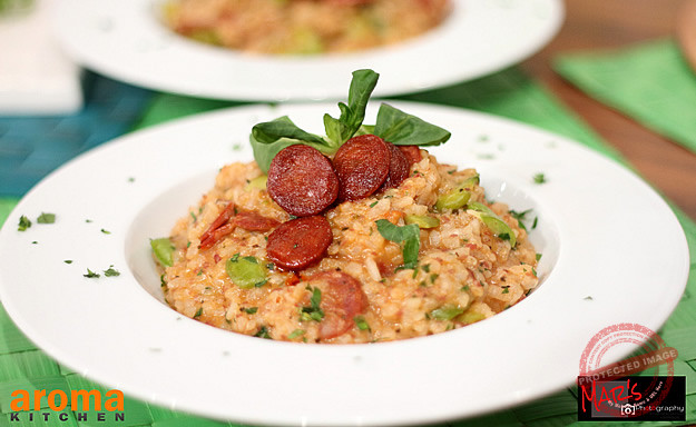Start by chopping both the parsley and Parmesan individually in the bowl. The parsley speed 5 for 10 seconds and the Parmesan speed 10 for 5 seconds. Remove from the bowl and put aside as you will need for serving at the end of the recipe. Place the oil, garlic, onion and bacon in Thermomix bowl and chop on speed 5 for 5 seconds. Scrape down sides, add thyme and sliced chorizo and sauté for 2 minutes, 100°, reverse speed 1. Add in the red wine and evaporate for 2 minutes, 100` reverse spoon, speed 1. Weigh the arborio rice using the Thermomix scale and add in with hot stock and cook for 10-12 minutes 100`, reverse spoon, speed 1. Add in the fresh broad beans and cook for 2 minutes, 100` reverse spoon, speed 1. When ready, stir in the chopped parsley and Parmesan and serve immediately.