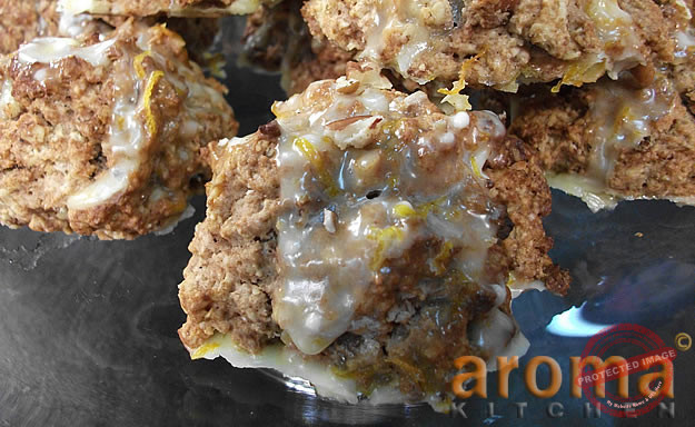 Start this recipe by placing the flour, oats, 50g sugar, baking powder, salt and butter in a bowl and rub together till the mixture resembles breadcrumbs. Mix together the milk, vanilla essence and egg in a jug and pour over the crumb mixture. Mix together with a spoon until the mixtures begins to bind together (do not over mix) Sprinkle over the chopped pecans, cinnamon and remaining sugar and give the mixture another mix. Place spoonfuls of the mixture on baking sheets covered with non-stick paper, and bake in the oven at 220 minutes, or just 11-13 minutes. This recipe is quite like scone dough, so it should need too much time in the oven. When the buns are cooked, remove them from the oven and immediately make the topping my mixing the orange juice with the icing sugar to make an icing. Immediately drizzle the orange icing all over the top of the warm buns and allow to cool before serving.