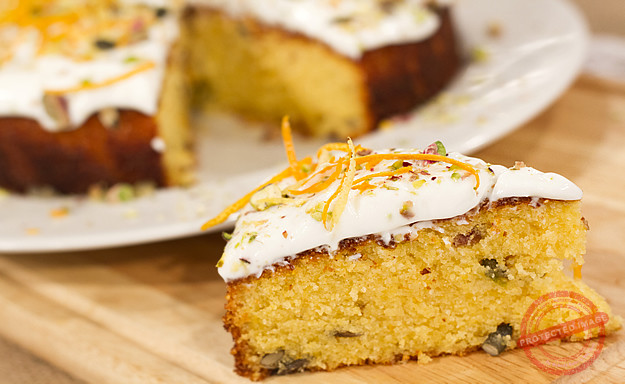 Kejk taċ-ċitru u l-polenta bil-jogurt Grieg u l-pistaċċi