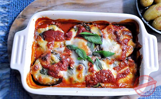 Start this recipe by frying the aubergine slices in a hot pan with the oil for a few minutes on each side. When ready, pop them into the oven to continue cooking for 10-15 minutes. When ready, remove from the oven and allow to cool. When ready, grease a large ovenproof dish or individuals dishes with a little oil and spoon a little of the tomato sauce in the bottom. Cover with a layer of the grilled aubergine, cover with more sauce and then sprinkle with a little of the grated Parmesan. Tear up the mozzarella and lay a few pieces on top, followed by a few fresh basil leaves. Repeat this process 3 times, but do not put any mozzarella or basil leaves on the top layer. Instead cover the top with a layer of grated Parmesan mixed with breadcrumbs. Bake in a hot oven at 200`c for 30-40 minutes or until golden and bubbling. Serve dressed with a few salad leaves on top or on the side.