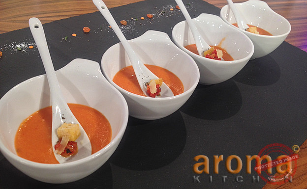 Cream of sweet red pepper and lentil, finished with baked baguettes topped with chorizo