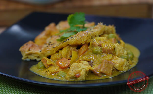 To make the filling, heat the oil in a pan and sauté the sliced leeks, garlic and carrots together for 4 minutes. Add in the chicken breast, curry, thyme and season well with salt and pepper and continue to cook for 3-4 minutes to brown the chicken. Add in the gammon, mango chutney, curry sauce and cooking cream and continue to cook for 2 minutes. Remove off the heat, stir in the peas and transfer the mixture into a large buttered ovenproof dish. Roll out the puff pastry, cut into various sized strips and cover the pie in a lattice design, weaving the strips together. Brush with beaten egg, sprinkle over the cumin seeds and sesame seeds and bake in the oven at 200°C for 30 minutes or until the pastry is cooked and golden.