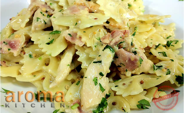 Start this recipe by cooking the pasta in a pan of salted boiling water, then drain and put aside. Meanwhile, prepare the sauce. Heat the olive oil in a frying pan and sauté together the red onion and garlic for a few minutes. Add in the chicken strips and bacon and cook for 5 minutes, or until the bacon is golden-brown and the chicken is cooked through. Season to taste with salt and pepper before adding in the white wine. Continue to cook for a further 2 minutes, then add in the chicken stock, cream, wholegrain mustard and cook for a further 4 minutes to reduce. Mix in 1/2 cheese then stir in the cooked pasta and chopped parsley. Serve immediately in large pasta bowls, and garnish with a sprinkling of chopped parsley on top and the remaining cheese. Suggested accompanying wine: DELICATA Pjazza Regina White I.G.T. Maltese Islands