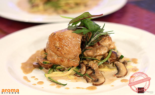 Start this recipe by seasoning the chicken thighs all over with salt and pepper. Heat large pan with 1 tbsp olive oil and seal the chicken all over on both sides till brown. Remove from the pan, add in the remaining oil, onion and garlic and sauté for 4 minutes to soften. Add in the chili and mushrooms and cook for 2 minutes. Splash in the wine to evaporate, followed by the cream, pesto and stock. Return the chicken back to the pan and reduce the sauce. Finally, add in the zucchini strips and cook for just 2 minutes. Stir in the Parmesan cheese and serve.