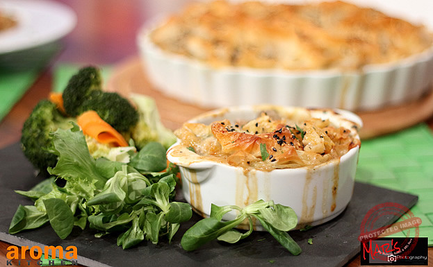 Start this recipe by softening the onion and garlic in the oil for 3 minutes. Add in the pork fillet pieces and pan fry just for 2 minutes. Add in the sliced mushrooms and rosemary and cook for 2 minutes. Add the contents of the mushroom soup to the pan and mix well. Add in the water and continue mixing over the heat until the mixture thickens. Stir in the chopped parsley, transfer the mixture to an oven dish and even out. Scrunch up the filo sheets and place on top of the filling. Brush lightly with the melted butter, sprinkle over the sesame seeds and bake at 200`c for 25-30 minutes, or until golden brown.