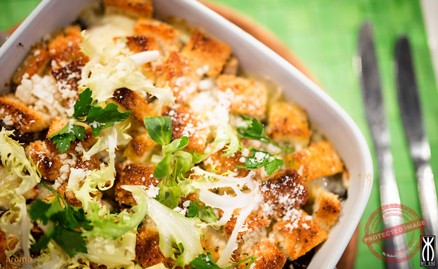 Start this recipe by grilling the seasoned aubergine slices on both sides until soft in a pan and put aside. Take a 25cm square oven dish and grease with a little oil. Cover the bottom with a layer of aubergine slices, followed by a layer of mozzarella slices. Spoon over a little tomato sauce, followed by the sliced tomatoes. Ext, cover with a layer of basil leaves. Spoon over half of the grated Parmesan and top with another layer of aubergines and mozzarella. Spoon over the remaining tomato sauce. Next, cut the dry bread slices into small squares and place into a bowl. Toss in a tablespoon of olive oil , the remaining grated Parmesan and a tsp dried mixed Italian herbs. Mix together well to coat the croutons, then spoon them over the Parmegiana. Bake in the oven at 200`x for about 10 minutes or until the croutons are golden brown and crispy. Allow to sit for 5 minutes before serving with a few salad leaves dressed on top.