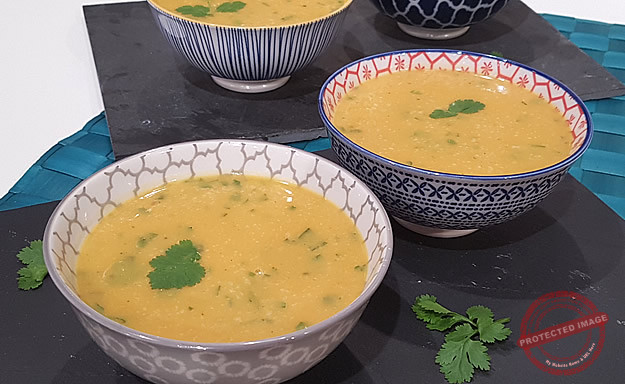 Heat the oil in a large pan and sauté together the garlic, leek, herbs and curry powder for 5 minutes till soft. Add in the pumpkin and sweet potato and cook for just 2 minutes. Season with salt and pepper, add in the bay leaf, lemon grass and hot stock and cook for 20 minutes. Remove the bay leaf, and lemon grass and blitz to a fine soup. Stir in the chopped coriander and serve.