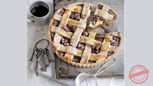 You can start this recipe by preparing the date and orange filling. Place all the ingredients except the walnuts in a saucepan, and cook for about 5 minutes on a low heat, till the dates are soft and creamy. Mix well to a nice smooth paste then mix in the chopped walnuts and mincemeat and put aside to cool. Next prepare the sweet pastry. Sift the flours into a large bowl and add the butter. Rub the ingredients together with your fingertips until the mixture resembles breadcrumbs. Add in the icing sugar, orange juice and zest, vanilla essence and the egg yolks and mix together to form a smooth pastry (alternatively you can prepare the pastry in a food processor). Wrap the sweet pastry in cling film and chill for 30 minutes in the fridge. When the pastry has chilled and firmed up, remove it from the fridge and discard the cling film. Roll out the sweet pastry using a rolling pin on a lightly floured surface to a thickness of 5mm and use to line the base and sides of a 24cm fluted flan tin. Press into the corners and trim off any excess pastry. Spoon over the delicious filling and even out with the back of a spoon. Use the trimmings to cut out strips and place decoratively on top of the filling to form a lattice design. Brush the surface with a little beaten egg and back in the oven at 180`c for 30-35 minutes, or until golden brown. Remove from the oven and allow to cool in the tin before dusting with icing sugar. Can be served whilst still warm or cold.