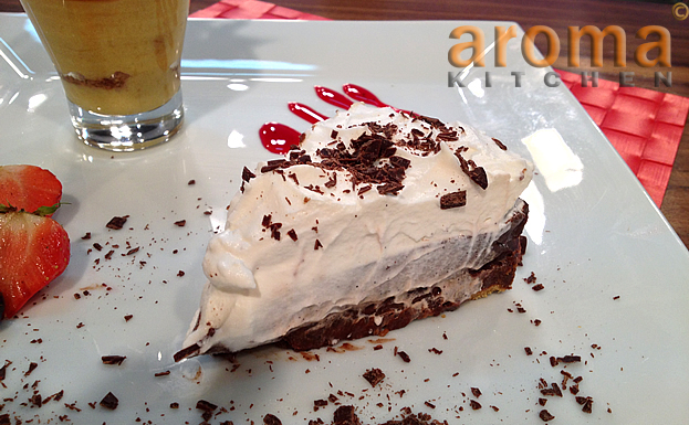 Put the digestive biscuits in a large plastic bag and crush them with a rolling pin until they resemble bread crumbs. Place them in a bowl and stir in the cocoa powder and melted butter. Mix well. Press and shape the mixture on to the base and sides of a 20cm round ring. Chill in the fridge for at least 30 minutes. Mix together the egg yolks, caster sugar, corn flour and 4 table spoons of milk. Put aside. Soak the gelatine leaves in a little cold water for about 10 minutes until softened. Heat the remaining milk in a sauce pan over low heat. Break both the chocolate into pieces, then add to the milk with the espresso grains, stirring until the chocolate has melted. Remove from the heat, then stir into the egg mixture. Return the mixture to the pan over a low heat and stir constantly until thickened and smooth. Drain off the gelatine leaves. Then add to the hot custard, stirring until the gelatine has dissolved. Cool for 15 minutes, then pour into the biscuit base. Chill for 3 hours or until set.