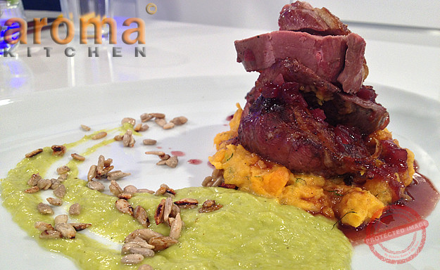 Seal the duck breast fat side first in a hot pan with no oil until golden brown. Remove from the pan and allow to sit. Meanwhile, boil the sweet potato for 10 minutes until cooked and remove the water. Add the butter, salt and pepper to taste. For the savour, shallow fry the onions and garlic in a little butter then add liver and cook for about 2 minutes. Add the chopped prunes and mix well .For the sauce, add the orange juice to a hot pan and reduce by half. Add the chicken stock and reduce by one third. Finally add enough honey, cream and butter till you achieve the correct consistency. Meanwhile, continue to cook the duck breast in the oven for a further 10 minutes at 180`c.(medium to well ). While duck is cooking heat the sweet potato and sauce and serve with the cooked duck breast.