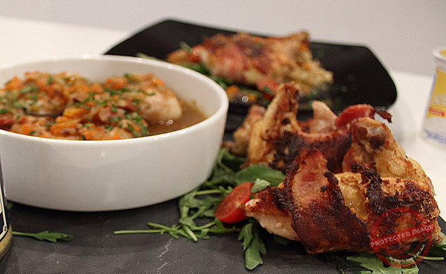 Joint the chicken into 4 pieces, legs & breasts apart, season with salt and pepper. Brush the breast with the mustard, wrap with bacon and grill. Lightly dust the legs and seal in a hot pan with melted butter until browned on both sides. Add in halve the onion, remaining vegetables and few springs of herbs, de glace with the beer, set to simmer for approximately 25 minutes. Meanwhile prepare the pilaff; shallow fry the onion in butter, sweat in the rice and mushrooms together with few herbs springs until glazed. Pour in the wine, allow evaporation, pour in the stock, bring to the boil. Remove from heat, cover with tight fitting lid and finish cooking in a hot oven for 20 minutes. Serve the chicken on a bed of rice.