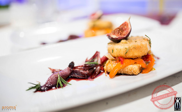 Beat the eggs and whisk in the flour and milk to form a batter, mix half the bread crumbs with sesame seeds and the other with chopped rosemary. Cut both from the middle and dip both in the egg mixture than the feta in the sesame breading and the goat cheese from the rosemary breading. Deep fry the breaded cheeses until browned. Cut the fig from the middle and sauté the middle part on a hot pan remove than add the quartered shallots, sugar and caramelize. Once well browned add the Marsala and simmer sauce until thick. Cut the vegetables in julienne and sauté until softened. Serve 1 feta and 1 goat cheeslet on each other with the sautéed vegetables in the middle, fig and rocket on top, drizzled with the shallot reduction.