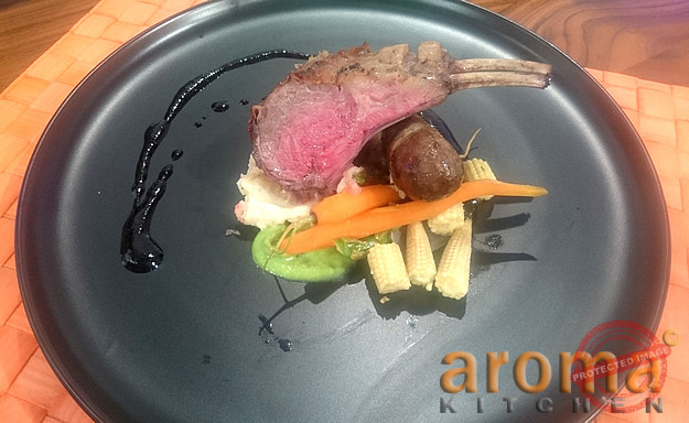 Prepare a double base pan and heat it up. Place the seasoned lab and seal it on both sides for 3 minutes. Remove and leave to rest on a draining tray, place the sausage and cook for 4 minutes. In another pot, put the diced potatoes and pour the milk and cream together with the crushed garlic. Bring to the boil and simmer for about 15 minutes until the potato is soft and the milk is nearly evaporated. Place the potatoes in a sieve and drain excess liquid, mash it with a fork or potato masher. Add 25g of butter, salt and pepper and cover with cling film to keep warm. Boil 50ml of cream with some salt and pepper, add the peas from frozen and blend everything together to get a smooth puree. Place the lamb in an ovenproof dish and put in a pre-heated oven and continue cooking for about 12 minutes. Assemble the dish to your liking.