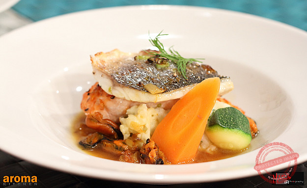 Duo of sea bream and salmon on a creamed dill mash and stewed mussels