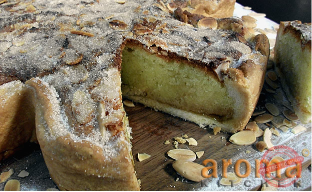Start by making the pastry. Sift the flour and salt into a bowl. Add the butter and rub into the flour mixture. Add the oil and mix. Add the sugar, lemon zest and vanilla. Mix and then add enough chilled water to be able to knead the mixture to a firm dough. Turn onto a floured surface and knead for 2 minutes. Wrap in cling film and stand for 30 minutes in a cool place. Grease a dove shaped baking pan with butter and dust with flour. Cut a sheet of aluminum foil and grease with butter. Roll out the pastry over a lightly floured surface and line the base and sides of the prepared pan with the pastry. Prick the pastry with a fork, and place the greased aluminum sheet buttered side down over the pastry. Lightly press the sheet over the pastry and also cover the edges of the pastry. Spread butter beans to act as weight evenly over the foil. Bake in a moderate to hot oven for 20 minutes. Bring out of oven, remove the foil and beans and leave to cool. Spread the apricot jam on the base of the pastry shell. Beat the butter and sugar until pale and fluffy. Add the eggs one by one while beating continuously. Beat in the ground almonds and almond essence. Fold in the flour and mix well. Pour the mixture into the baked pastry shell and smooth the surface. Bake in a moderate oven until risen and lightly browned. Bring out of the oven and stand for 20 minutes before turning out of the pan. Leave to get cold. Decorate with a sprinkling of icing sugar and the slivered almonds.