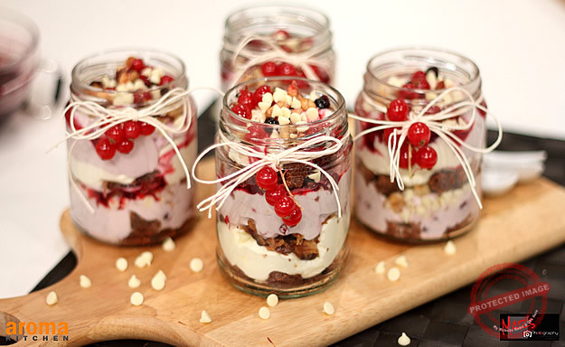 Start this recipe by making the syrup. Place all the ingredients except the alcohol in a saucepan with 250ml water and cook together for 5-10 minutes. Remove off the , add in the liqueur and allow to cool down completely. To make the cream filling, mix together the whipped cream, cold custard, white chocolate and orange zest. Divide into 2 bowls. Blitz half the defrosted berries and mix into half of the cream filling. To put the trifles, place a few cubes of sponge in the bottom of the trifle jars. Spoon over some of the prepared syrup to soak well. Next, spoon over the remaining ½ berries, ½ of the walnuts followed by the white cream filling. Add another layer of sponge and soak again with the liqueur. Next, spoon over the berry cream filling followed by the remaining walnuts and white chocolate chips. Place into the fridge and chill for a few hours before serving.