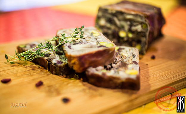 Start this recipe by soaking the porcini mushrooms in 100ml boiling water. Line a non-stick loaf tin with the slices of prosciutto and put aside. Fry the mushrooms in the butter and olive oil until brown for 3 minutes. Add in the soaked porcini mushrooms with the juices, cranberries, port and the mushroom stock pot. Cook for 3 minutes then remove off the heat. Next, add in the breadcrumbs, pistachios, breadcrumbs, chopped chives, beaten eggs and double cream. Spoon the mushroom mixture on top of the proscuitto and press down well. Level out, fold the edges of the prosciutto over the mixture and bake in the oven at 200`c for 20 minutes. Allow to cool down completely before serving with slices of toasted French stick.