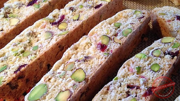 Preheat the oven to 160`c. In a large bowl, mix together oil and sugar until well blended. Mix in the vanilla and almond extracts, then beat in the eggs. Combine flour, salt, and baking powder; gradually stir into egg mixture. Mix in cranberries and nuts by hand. Divide dough in half and form two logs on a lined baking sheet (It may be sticky). Bake for 35 minutes in the preheated oven, or until light brown in colour. Remove from oven, and set aside to cool for 10 minutes. Reduce oven heat to 135`c. Cut logs on diagonal into 3/4 inch thick slices. Lay on sides on parchment covered cookie sheet. Bake approximately 10-15 minutes, or until crunchy.