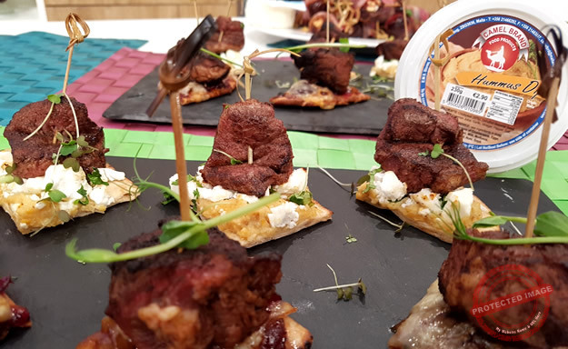 Dice the beef and lamb in 12 cubes, mix the beef in paprika and the lamb in mixed spice put each piece of meat on a separate toothpick and grill. Slice the onion and saute with the sugar until caramelized. Spread one of the pitta with cranberry saute and spread the onion on, sprinkle the rocket on than insert the beef skewers around the outside, finish with the parmesan and cut the 6 segments. Spread the other pitta with hummus, sprinkle with rocket, insert the lamb around the outside and finish with crushed feta cheese.