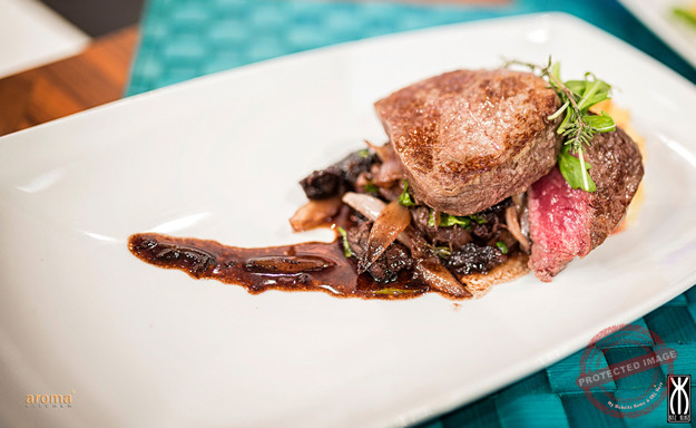 Fillet of beef migions with gorgonzola potato cake accompanied with a prune & liver compote