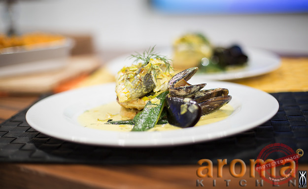 Sauté lightly the chopped garlic and leeks until softened, add mussels toss well than add wine and cream. Remove mussels and pour sauce on fish in a small oven dish, braise the fish in the sauce at 170`c. Using a round Cutter, cut 4 puff pastry round bases and in their middle place a mixture of roughly chopped salmon and prawns together with the zest and marjoram. Bake in oven until pastry in golden brown and serve 2 on each other for each portion. Sauté the spinach in a separate sauté pan in garlic oil and serve underneath the fish. Serve the braised soft fish topped with the mussels and cream saffron sauce.