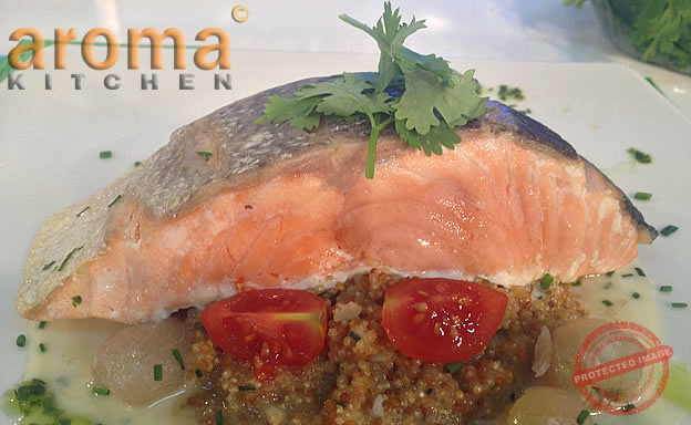 Fillet of Salmon on a bed of quinoa with Muscat grapes and fish cream
