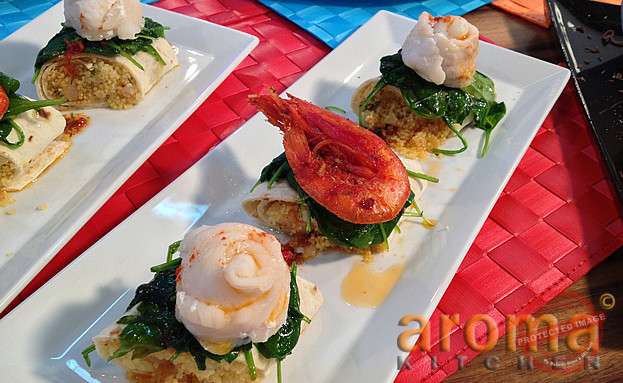 Chop 3 cloves garlic, ½ onion, king prawns and fry in little oil, add the lobster bisque and bring to the boil. Toss the cous-cous in olive oil add thehot lobster bique and cover to cook slowly. Grill the tortillas from both sides put the couc-cous in the middle and fold thitly. Blend well the sundried tomatoes garlic oil and dill and allow to rest in the fridge, adjust with some pepper to your dressing tastes. Pan fry the grouper in olive oil and butter season well and finish in a pre heated oven at 180`c. Fry the spinach lightly in some chopped garlic and salted butter and serve.