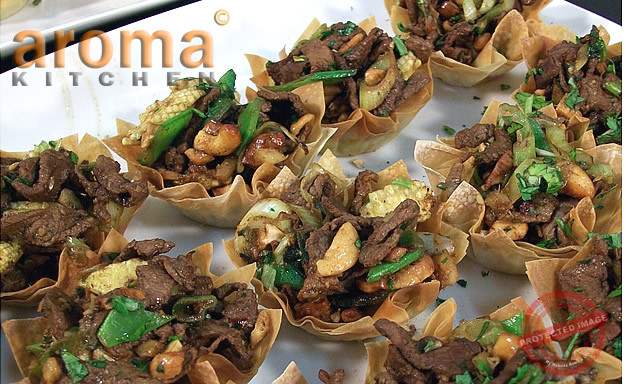 Filo cups with beef and cashew nut stir-fry