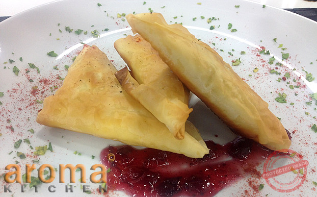 Combine all the ingredients and blend thoroughly. Open the filo and cut in 7cm strips, in twin sheets. Scoop a lump of the mix on each strip and fold in a samosa, sealing the edges with melted butter. Shallow fry or bake until golden brown.