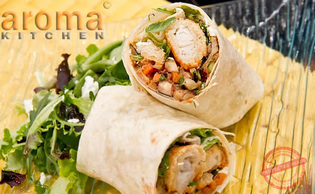 Start this recipe by heating the oil in a pan. Add in the sliced onion and carrot and fry for 2 minutes. Add in the sliced aubergine and carry on to stir fry for a few minutes. Season well with salt and pepper then remove off the heat. Chop some fresh basil and coriander and mix in. To put the dish together, lay the raps down and spread with the mayonnaise. Lay a layer of salad leaves down the middle, followed by the stir fried vegetables. Lay on the fish bocconcini, then spoon over the spicy salsa. Finish off by crumbling over the feta cheese. Roll up the wrap tightly and cut in half before serving.